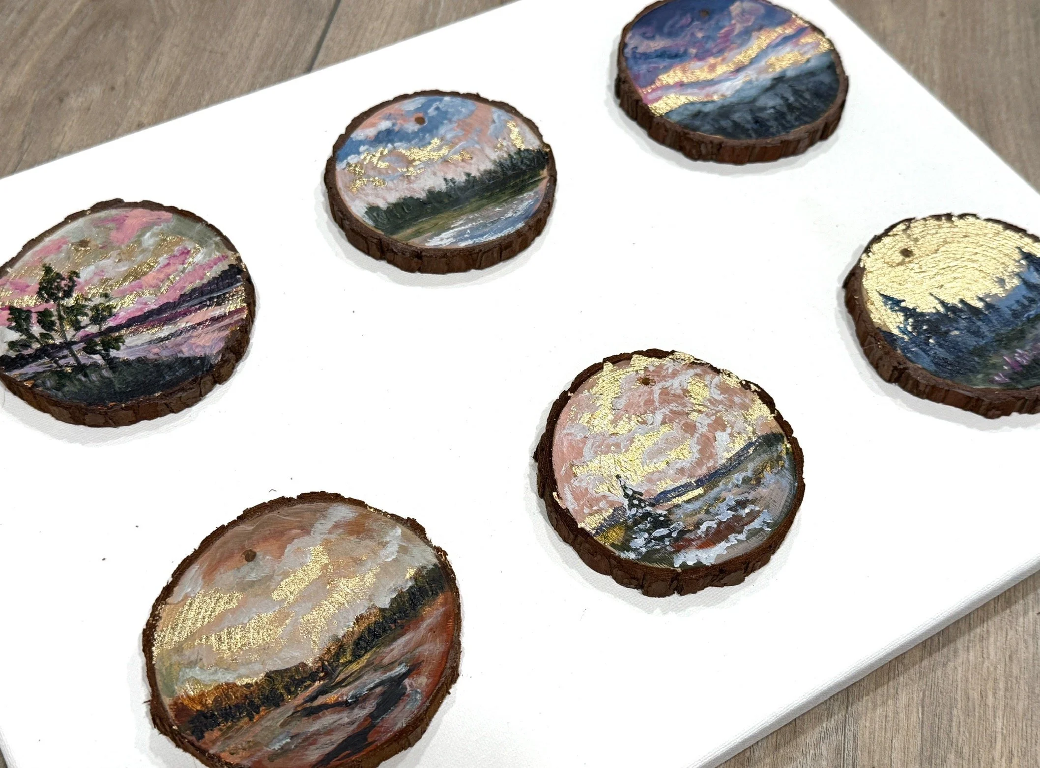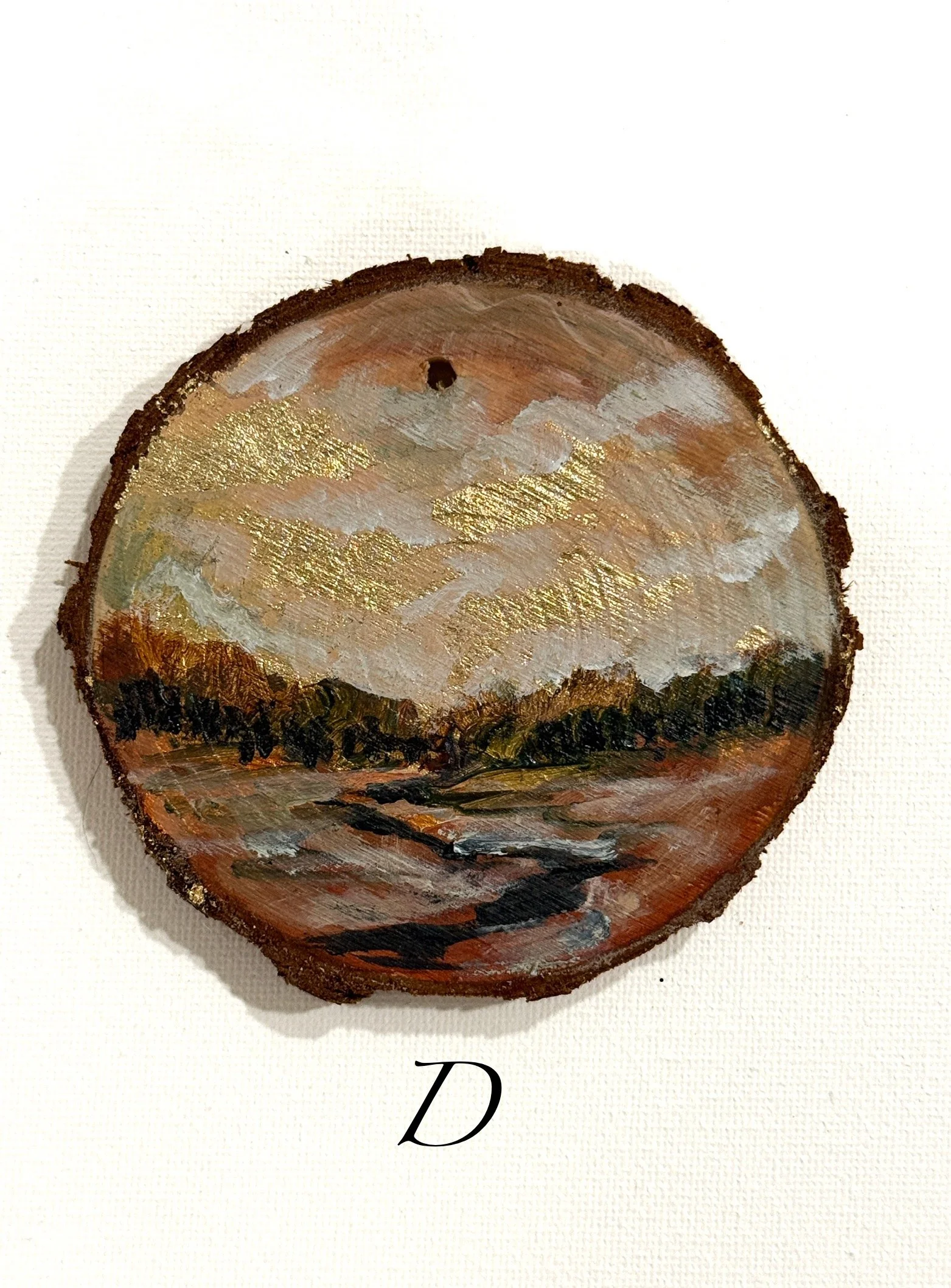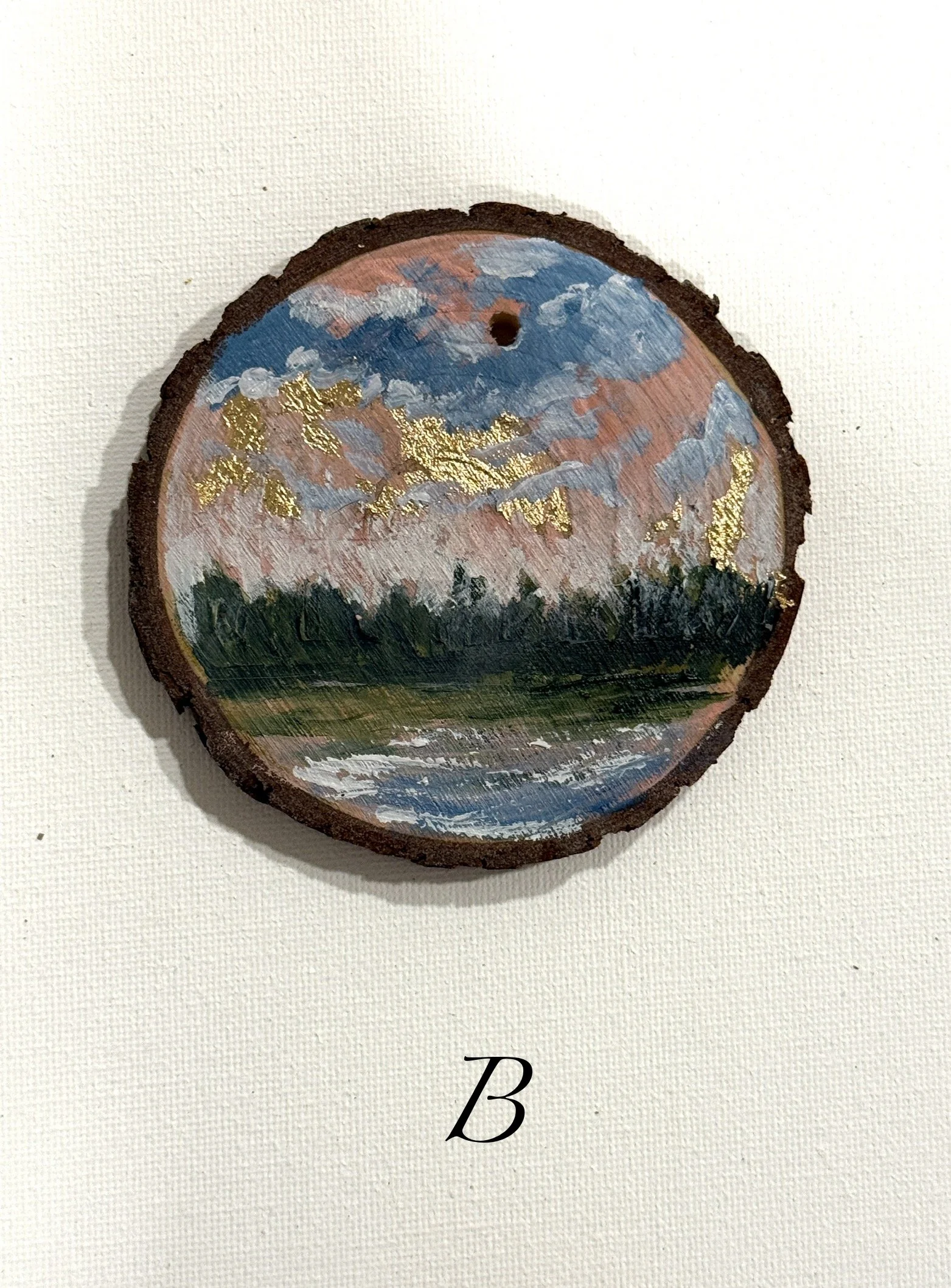 Bring a peaceful touch of nature to your holiday decor with these hand-painted ornaments. Each wood round features an original mini landscape painted in acrylic — inspired by fields, rivers, and horizons touched with light.