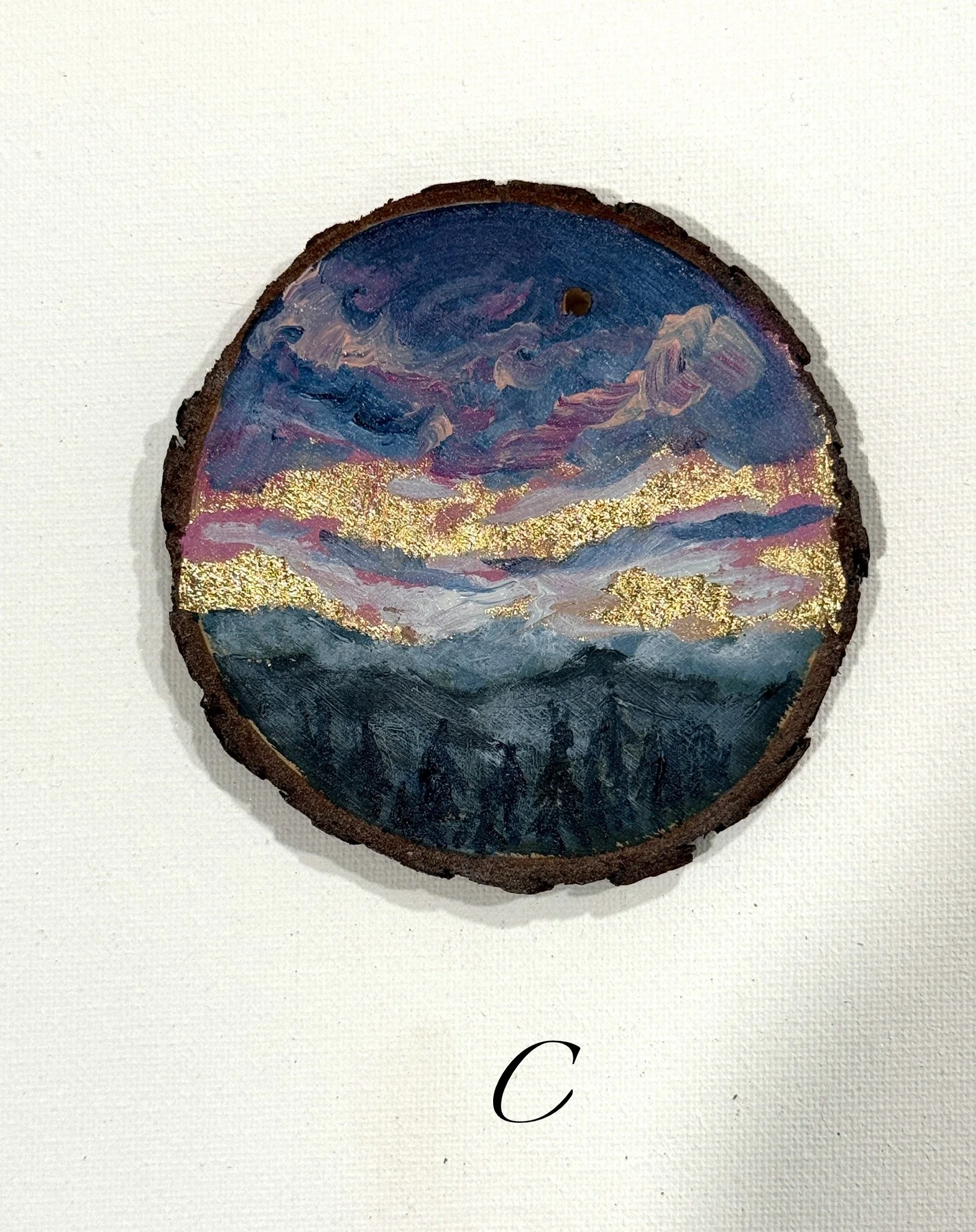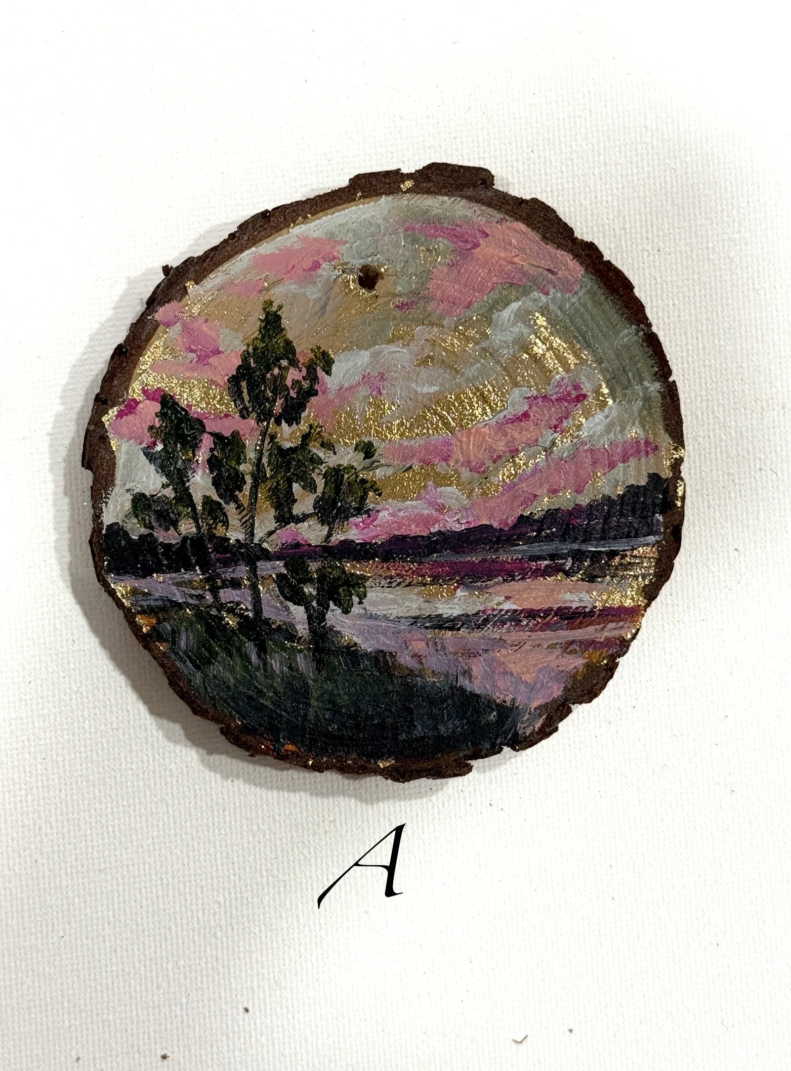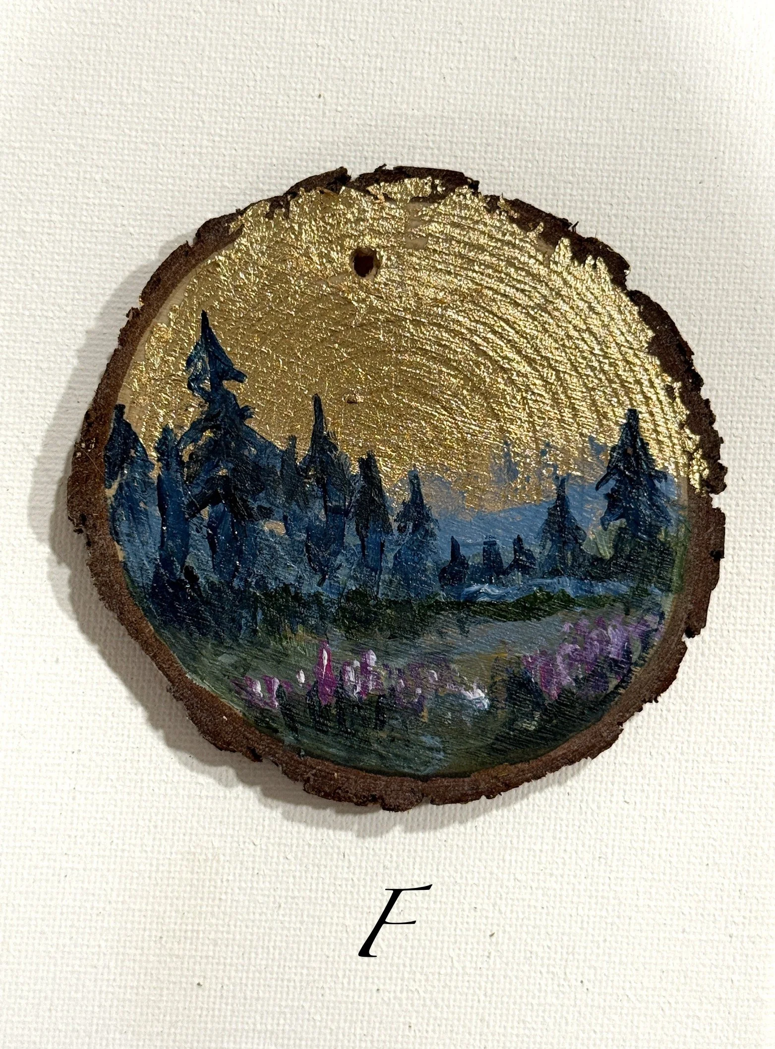 Bring a peaceful touch of nature to your holiday decor with these hand-painted ornaments. Each wood round features an original mini landscape painted in acrylic — inspired by fields, rivers, and horizons touched with light.