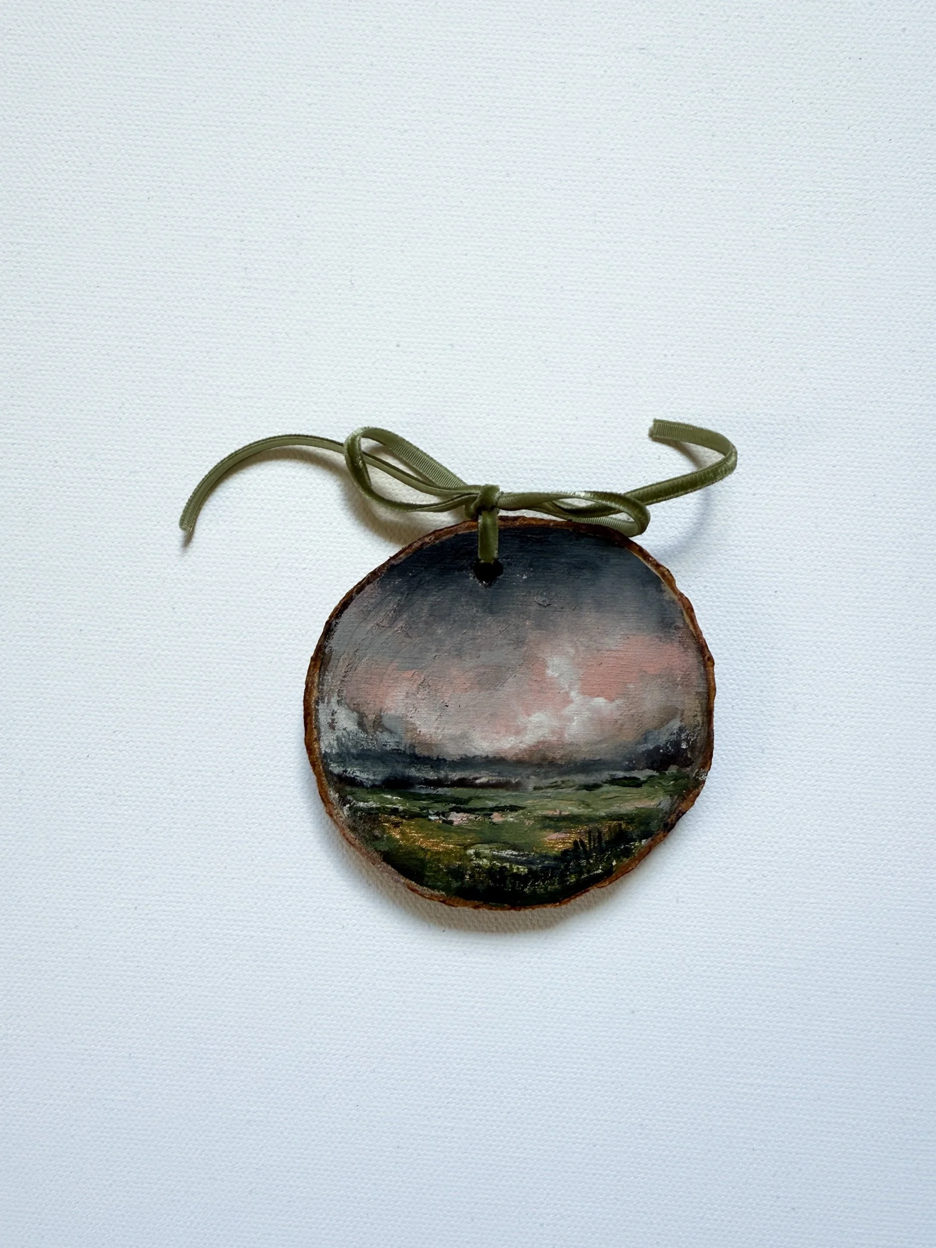 Bring a peaceful touch of nature to your holiday decor with these hand-painted ornaments. Each wood round features an original mini landscape painted in acrylic — inspired by fields, rivers, and horizons touched with light.