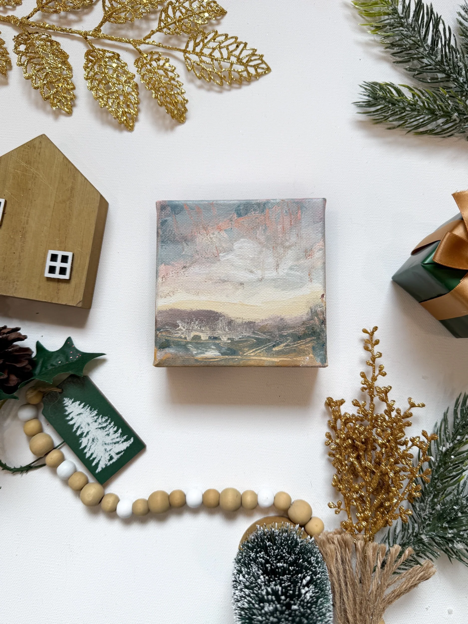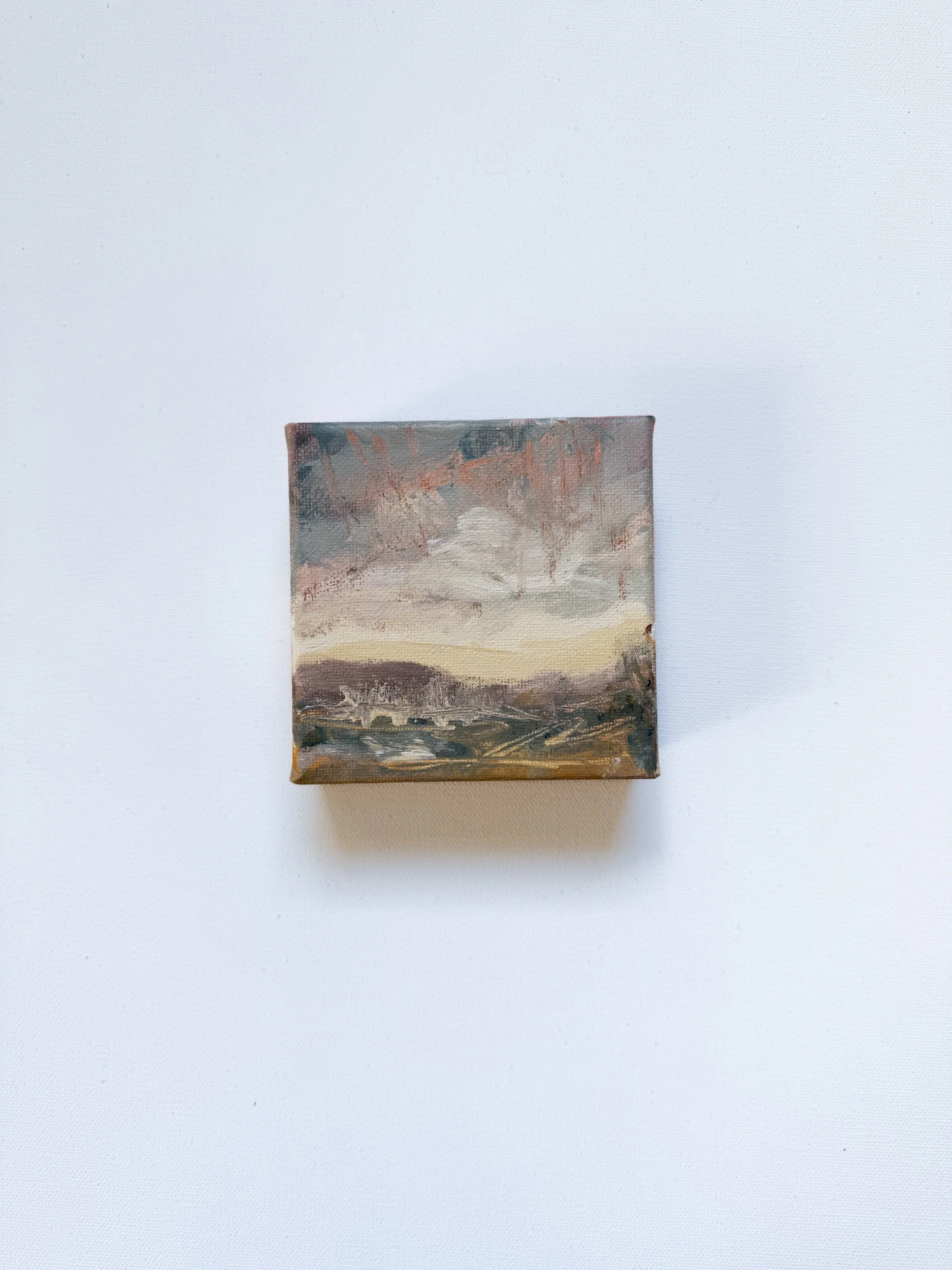 These 4x4” mini paintings bring abstract landscapes to life, each crafted with layers of acrylic and mixed media. Small yet impactful, each piece embodies a unique landscape, blending textured brushwork with mixed media accents to create an atmospheric scene.